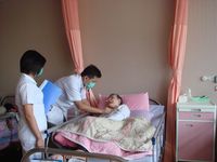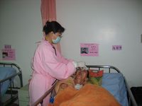 :專業護理人員給予量血壓,體溫,脈搏, 清除肺氣管內分泌物護理(拍痰、抽痰),傷口處理,藥物指導使用。